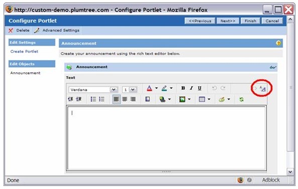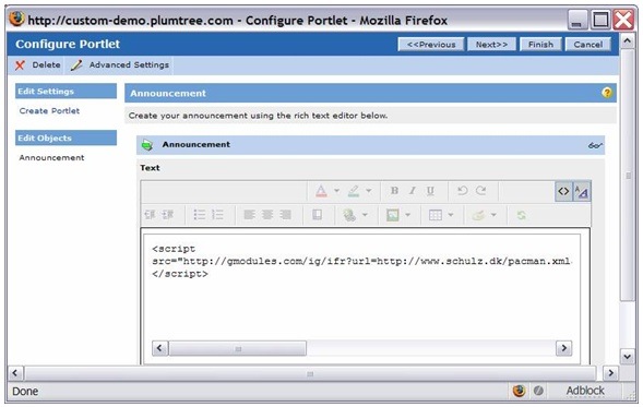 - Create a new Announcement portlet in the portal (AquaLogic Interaction). In the administrative preferences for that portlet toggle to the source view: